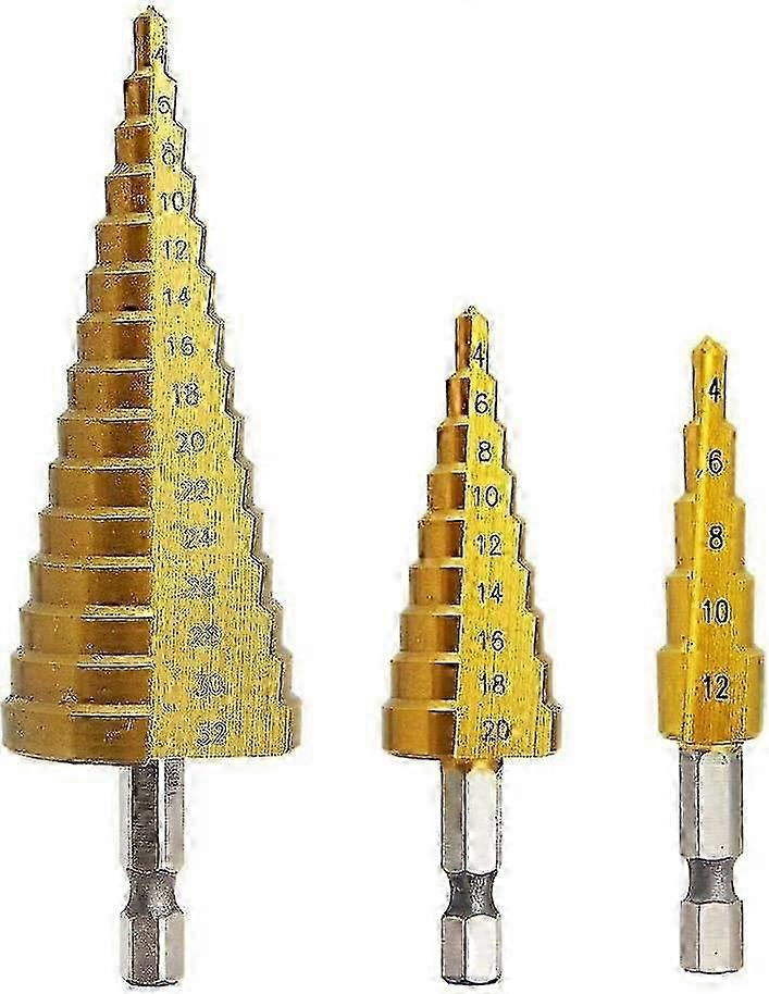 About This Item Premium Quality: Made of titanium coated high speed steel, fully polished, forged and heat treated, strong and durable. Titanium coating to reduce friction and heat from steel. Comes with 4-12mm 5-step drill bit, 4-20mm 9-step drill bit and 4-32mm 15-step drill bit. Hex Shank - Comes with Hex Shank 1 or 4" standard, fits all power tools like electric drill and electric screwdriver. Hex shank can just stick the bits stably in the chuck without screwdriver, avoid slipping when tightening. Dual flute design: Double flute design for optimal speed and precision, smoother cutting, each step is clearly labeled with the diameter of the depth in steps It comes with a little pressure and very cutting easily through wood, brass, steel, sheet metal and other surfaces. Exquisite workmanship: Mark hole locations and start drilling holes with drill bits and screws, preventing the slip - Heat treated alloy steel punch with precision sharp point - Corrosion resistant brass body with non-slip knurled grip. Includes a handy nylon storage bag to protect them. Versatile: suitable for drilling holes in a variety of materials, including mild steel, brass, wood, plastic, aluminum, copper, sheet metal, metallic materials, fiberglass, PVC, etc. Easy to carry with nylon bag, convenient to store in handbag, car or home. Perfect for professional and home use.