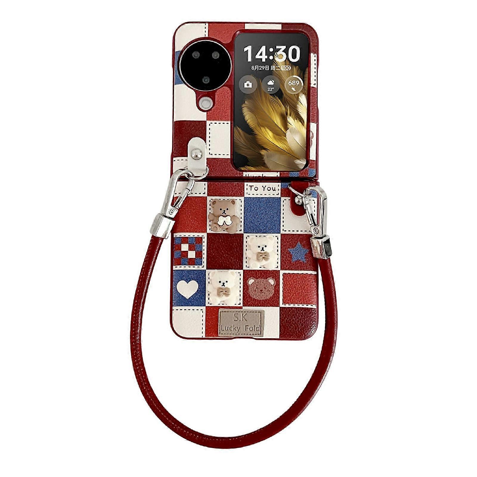 Lattice Little Bear Pattern Full Coverage Phone Case with Wrist Strap For OPPO Find N3 Flip
