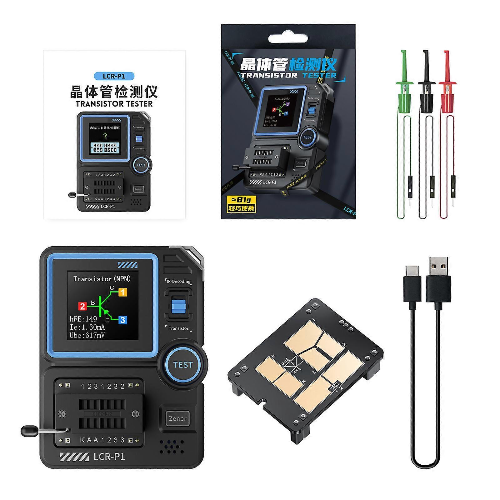 Features: The LCRP1 Transistor Tester is a high-precise, multifunctional electronic testing device specifically for electronic engineers, technicians, and enthusiasts. This device is intended for detecting and analyzing the performances and characteristics of semiconductor components such as transistors, diode, triodes, and field-effect transistors (FETs). Equipped with a color screen, it allows for multiparameter measurement of various components, automatically identifies the type and pin arrangement of the tested component, simplifying the operation process and enhancing testing efficiency. Intelligent antiburning design: Uncharged capacitors automatically discharge upon insertion, with a user-friendly protections mechanism to prevent damage. Data export: Supports connecting to a computer to export data, easily transferring the collectings measurement data to facilitate in-depth analysis on the computer. Alternate Measuring Modes: Innovatively incorporates replaceable test boards, easily tackling diverses test needs for unprecedented convenience and efficiency. Intelligent Recognition Components:Simply Plugs & Clamp, 1Button Quick Identification of Component Parameters, Saving Time and Effort.Zener diode independent measurement: Independent measurement channel for measure diode, measuring 0.01-32V with pre-measurement power supply for precise result. Specifications: Component:ABS Size:Approx.87x71mm/3.43x2.8inch Package Includes: 1pc Transistor Tester 1pc Test Board 1pc Data Cable 3pcs Teasting Hook 1pc Manual note: Please allow 1mm errors due to manual measurement. Due to the differences between different monitors, the picture may not reflect the actual item color.