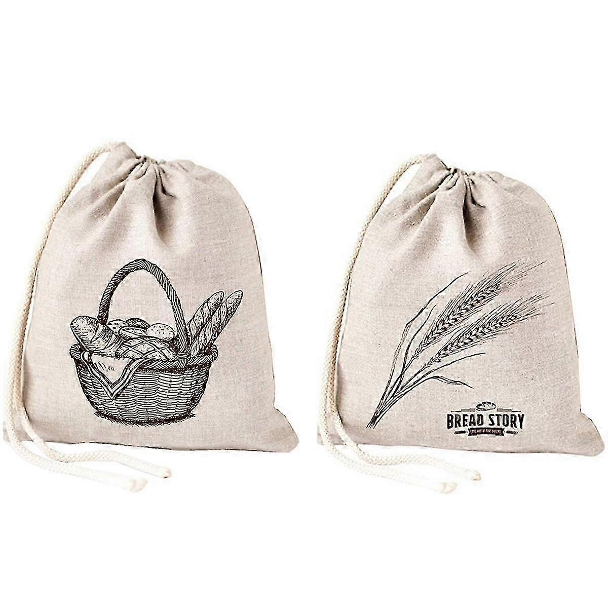 Linen Bread Bags -2 Pack Art Design Natural Unbleached Linen Reusable Food Safe Storage For Homemade Artisan Bread