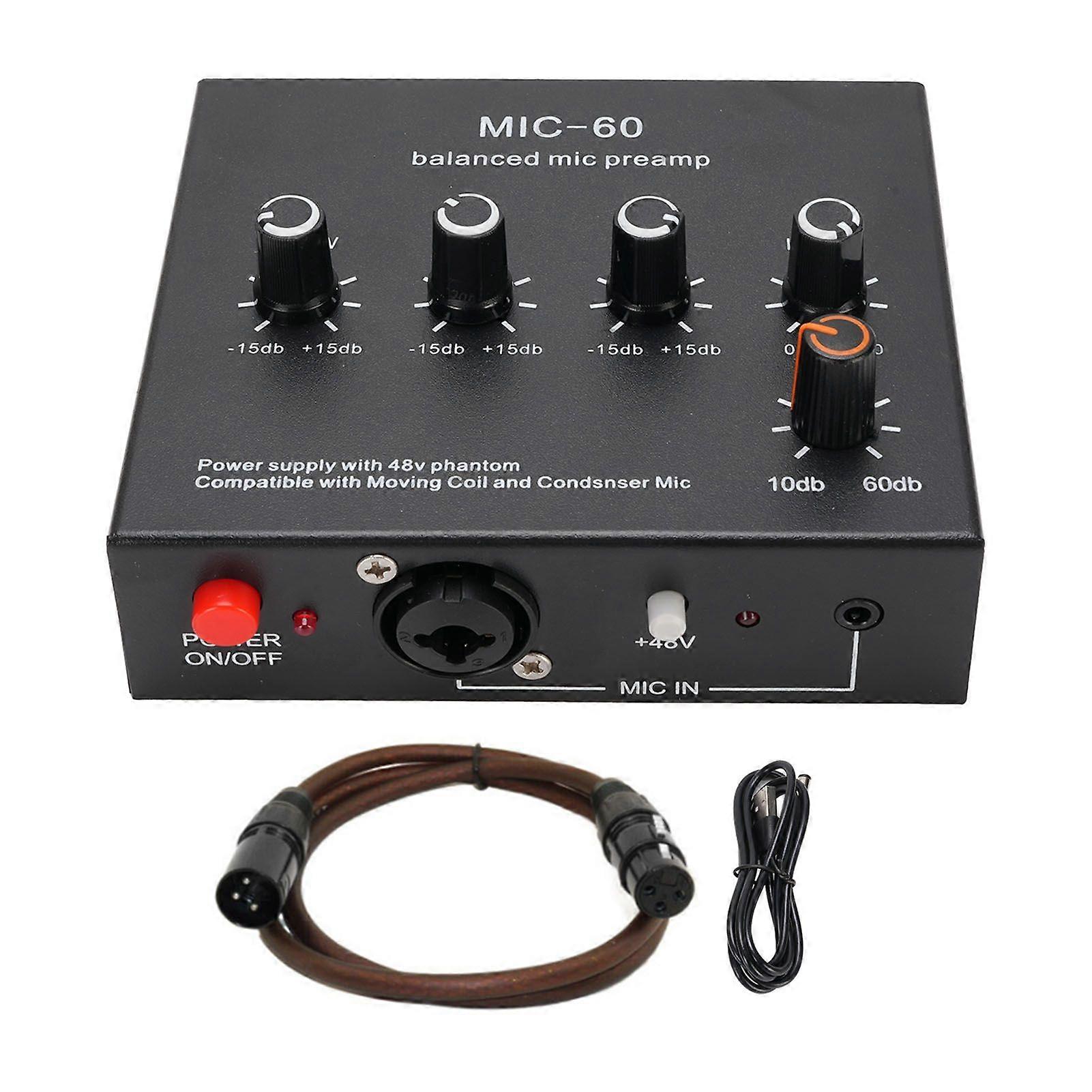 Microphone Preamp Mic Gain Booster 48V Power Supply Mic Pre Amp for Dynamic Condenser XLR 3.5mm 6.35mm Inputs Outputs With XLR Cable