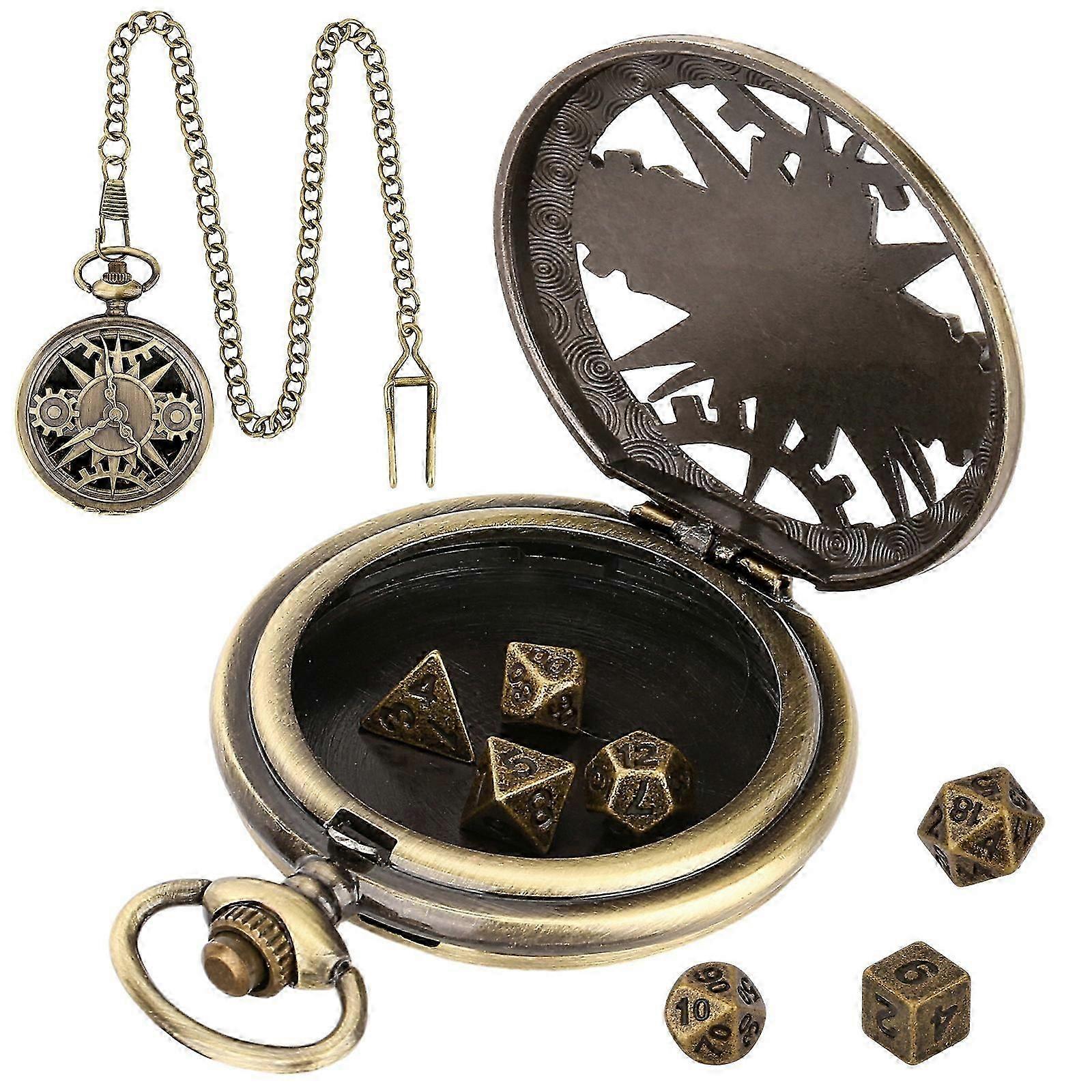 Mini DND Dice Set with Dice Set, 7 Polyhedral Metal Dice, Steampunk Style Watch, Bronze