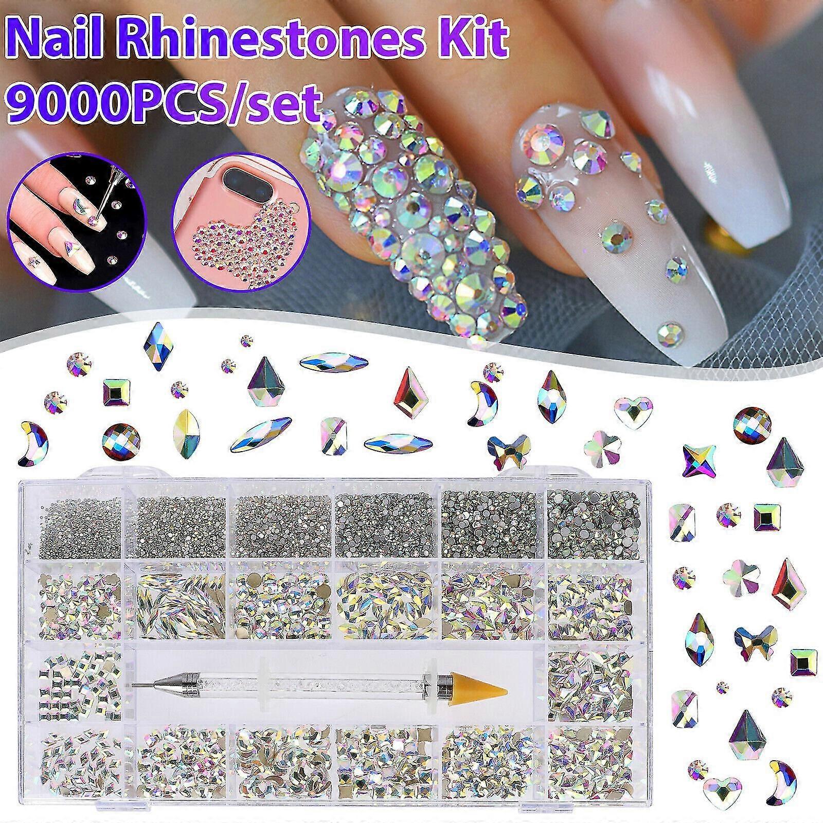1 Box Nail Art Rhinestones Glitter Crystal AB Nail Art Tools Tool Kit Set Nail Art Tools Feature: 9000pcs Crystal Nail Art Tools : Include 14 different styles AB crystals Nail Art Tools , each shape 50pcs; 8300pcs 6 sizes round rhinestones; 1pcs picking up pen; 1pcs transparent 21 grids storage box. Long Lasting Sparkle: Nail Art Tools Crystals will be covered on surface with water-proof AB coating. With golden flat back, the light shine into AB crystal then reflect iridescent and twinkling radiance. Exquisite and Beautiful: Nail Art Tools very hard and not easily break. With durable sparkling and brightness, Nail Art Tools add sparkle and glamour to your crafts, make your nails more dazzling and charming. Multi-function Pen: Picking up pen for rhinestones helps you finish nail art craft very easily. You can use tip to pick up beads, and then adjust them in right place by the other metal tip. Wide Applications: Fashion nail crystal jewelry DIY. It works very well for your nail art, DIY craft decorating, clothes, shoes, bag, hats, cellphone case and so on. You may embellish anything loved Product Specification: Type:Crystal AB Nail Art Tools Nail Art Tools Meterial:Crystal Nail Art Tools Color:Colorful Shape:20 different styles shape Style 1 (4*6mm):50pcs Style 2 (4*4mm):50pcs Style 3 (6*6mm):50pcs Style 4 (4*8mm):50pcs Style 5 (6*8mm):50pcs Style 6 (6*6mm):50pcs Style 7 (5*8mm):50pcs Style 8 (4*6mm):50pcs Style 9 (5.5*7mm):50pcs Style 10 (5*8mm):50pcs Style 11 (6*6mm):50pcs Style 12 (5.5*6mm):50pcs Style 13 (4*8mm):50pcs Style 14 (3*11mm):50pcs Style 15 (5*5mm):1100pcs Style 16 (3*3mm):1440pcs Style 17 (2.5*2.5mm):1440pcs Style 18 (2*2mm):1440pcs Style 19 (1.5*1.5mm):1440pcs Style 20 (1*1mm):1440pcs Quantity:9000pcs (50*14pcs+1440*5pcs + 1100*1pcs) Package Included 9000 x Nail Crystal Nail Art Tools 1 x Double Head Picking Up Pen 1 x Storage Box