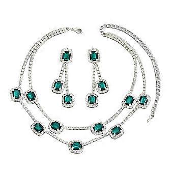 Necklace and Earrings Set, Women's Simple Double Layer Design Inlaid Diamonds Emerald Earrings Versatile Collar Chain