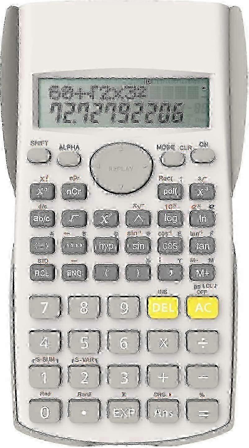 Professional grade scientific calculator with 240 scientific functions. Easily handles 1 and 2 variable statistical calculations, three angle modes (degrees, radians, and grads), and scientific or engineering notation modes 12-digit widescreen HD display. 2-line display shows inputs and results at the same time. Works efficiently and makes no mistake Meets the ergonomics design and offers a comfortable grip. Responsive buttons, clear numbers, and scratch-proof Solid sliding protective case covers either side of the calculator. Protects buttons and the device body Package includes: Scientific Calculatorx1, instructions Colour Name:sci- White Note: Due to the light and screen setting difference, the item's color may be slightly different from the pictures. Please allow slight dimension difference due to different manual measurement.