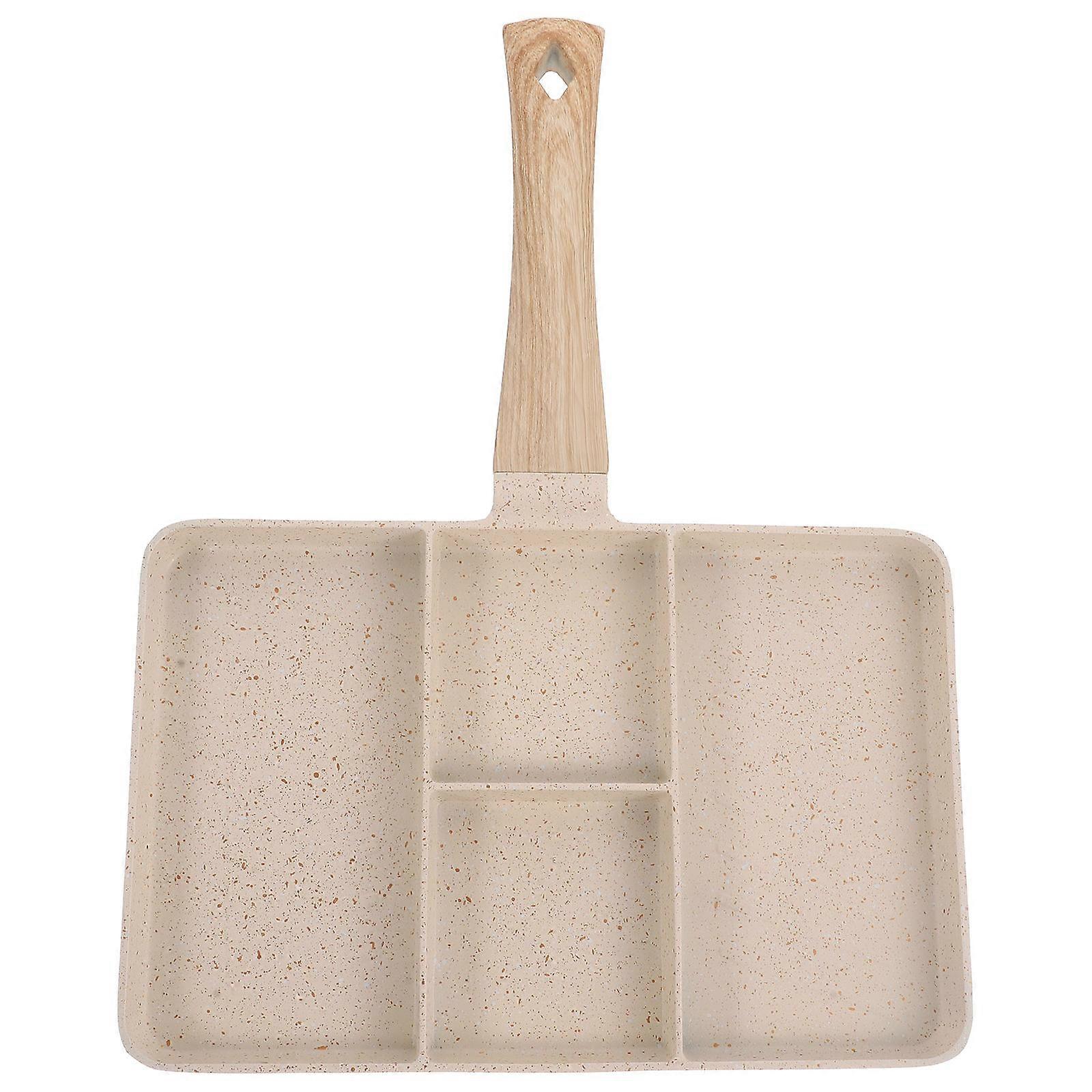 Frying Pan is made of , and you can rest assured to use. The non-stick pan is convenient to use and clean. With creative design, it can keep food from rolling and sliding. Wear-resistant bottom design of the pan can heat evenly and save effort. It is perfect for making fried eggs, sandwiches, chicken, egg , etc. Features -Color:Beige -Material:Aluminum alloy and wood -Size:35.00X27.50X2.30cm/13.76X10.81X0.90in -Note: the handle has differences -It has the characteristics of hard texture, not easy to deform, good heat transfer effect. -Plural grooves design egg frying pan is suitable for use in home kitchen, restaurant -The surface is non-sticky, clean and . A great egg and pancake cooking tool -Cooking is quicker and easier, requiring only a few simple steps. Division design can cook bacon, eggs, sausage, steak, chicken breast and other ingredients at the same time -Non stick coating, and healthy, easy to cook, stains are not easy to remain Package list: 1 x Frying Pan