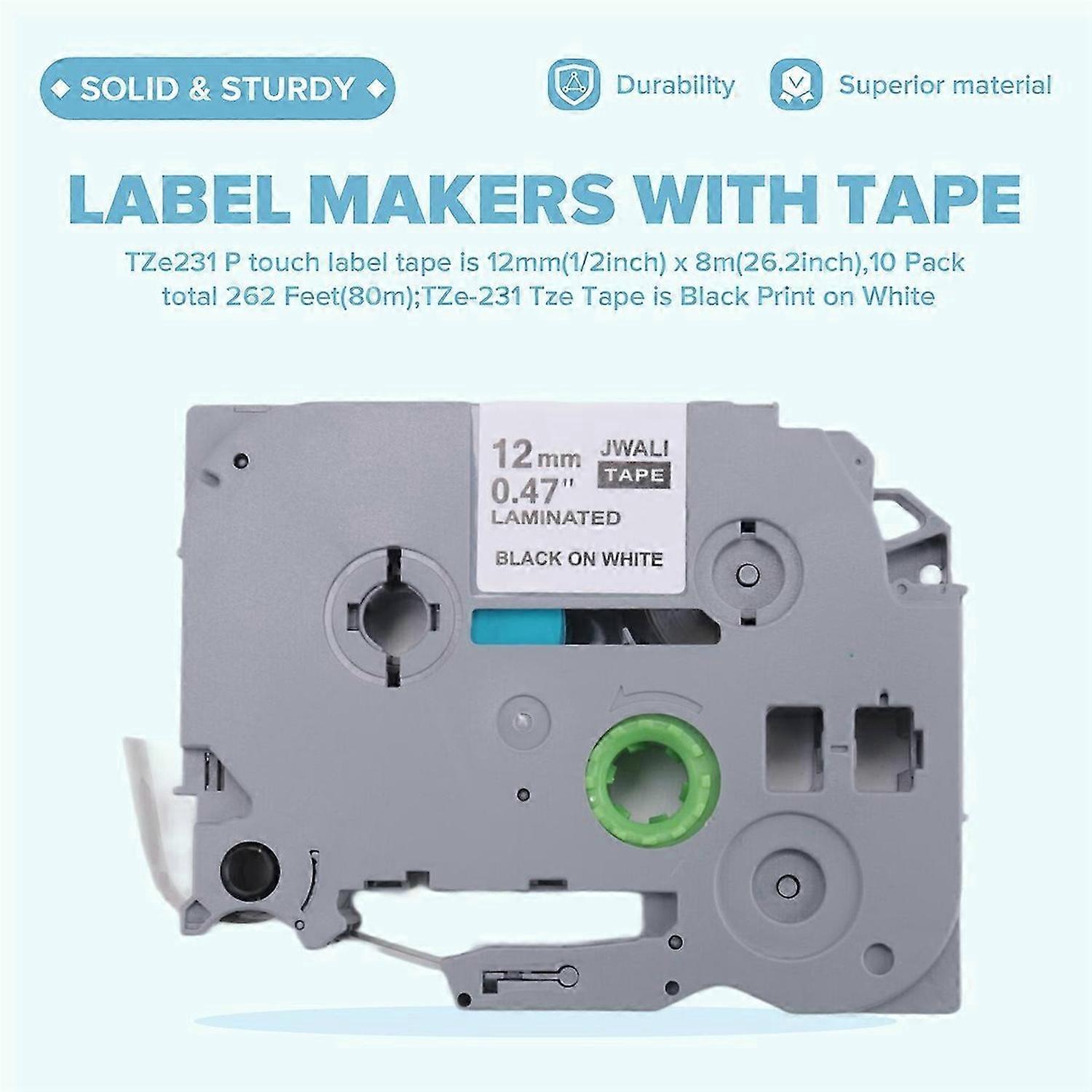 Package:A total of 10 pieces replacement for Label Maker Tape tze-231 in ;TZe231 P touch label tape is 12mm(1/2inch) x 8m(26.2inch),10 Pack total 262 Feet(80m);TZe-231 is Black Print on White Advantage: Our P-Touch label Maker Tape 12mm tape uses thermal transfer technology for printing, printing without ink or toner; Back cut design is easy to peel. Features: Replacement for label maker refills is Laminated tape,so the tape PV-Resustant, Waterproof, Rub-, -, Fade . Application: Ptouch tape strong adhesive laminate is suitable for indoor or outdoor use, even in bad weather conditions.including in office, kitchen, bedroom, schools, labs etc. Compatible with P-touch Label Makers: P Touch PTD200, PTD210, PTD215e, PTD400, PTD400AD, PTD400VP, PTD450, PTD600, PTD800W, PTE100, PTE105, PTE110, PTE300, PTE500, PTE550W, PTE800W, PTH100, PTH110, PTH300, PTH300LI, PTH500LI, PTP700, PTP750W, PTP900W, PTP950W, PT11Q Label maker<br><br>Colour:As shown Material:plastic<br><br>Package Contents: 10 x Label Maker Tape<br><br>Only the above package content, other products are not included. Note: Light and different displays may cause the color of the item in the picture a little different from the real thing. The measurement allowed error is +/- 1-3cm.