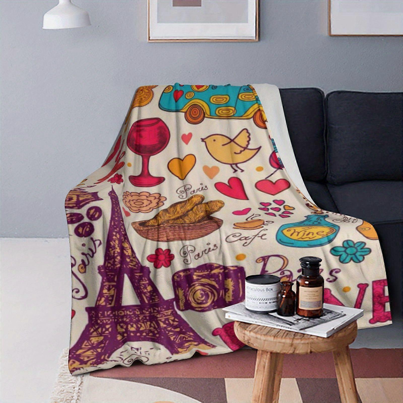 Paris-Inspired Digital Print Flannel Blanket - Ultra-Soft 100% Polyester, All-Season Machine Washable Throw for Sofa, Be-OPAZV79