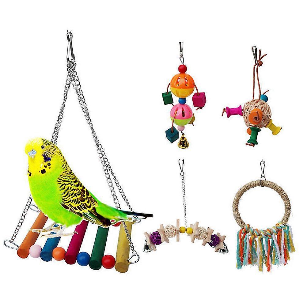 Parrot Chewing Swing Toy Bell Shape String Set Indoor Use Wood Plastic Metal Rattan Skill Development 5Pcs