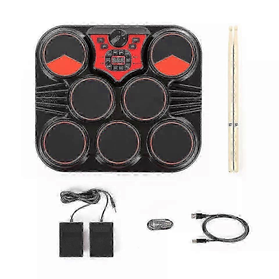 A.5 drums and 3 rubs, built-in dual speakers, with recording/playback function; small size and portable, suitable for students or professionals to play; B. The USB interface can realize charging and computer data connection at the same time, and use the mobile phone adapter plug to supply power for the electronic drum. C. 5 timbres, 10 demo songs, with metronome function. Can play pop, rock, Latin, electronic and other styles; D. The hi-hat is controlled by the pedal to simulate the real hi-hat effect, with the sound effect of closing the hi-hat, opening the hi-hat, and pedal hi-hat; E. Bass drums are simulated by pedals, and hands and feet are used together to practice more like real drums, so as to train good coordination of hands and feet; F. Headphone output, you can practice without disturbing others; G. MP3 song input, simulating the real percussion performance with the song, and realizing song playback by connecting to a mobile phone or a tablet; H. Built-in polymer lithium battery, it can be used continuously for about 10 hours after fully charged; (stand not included)