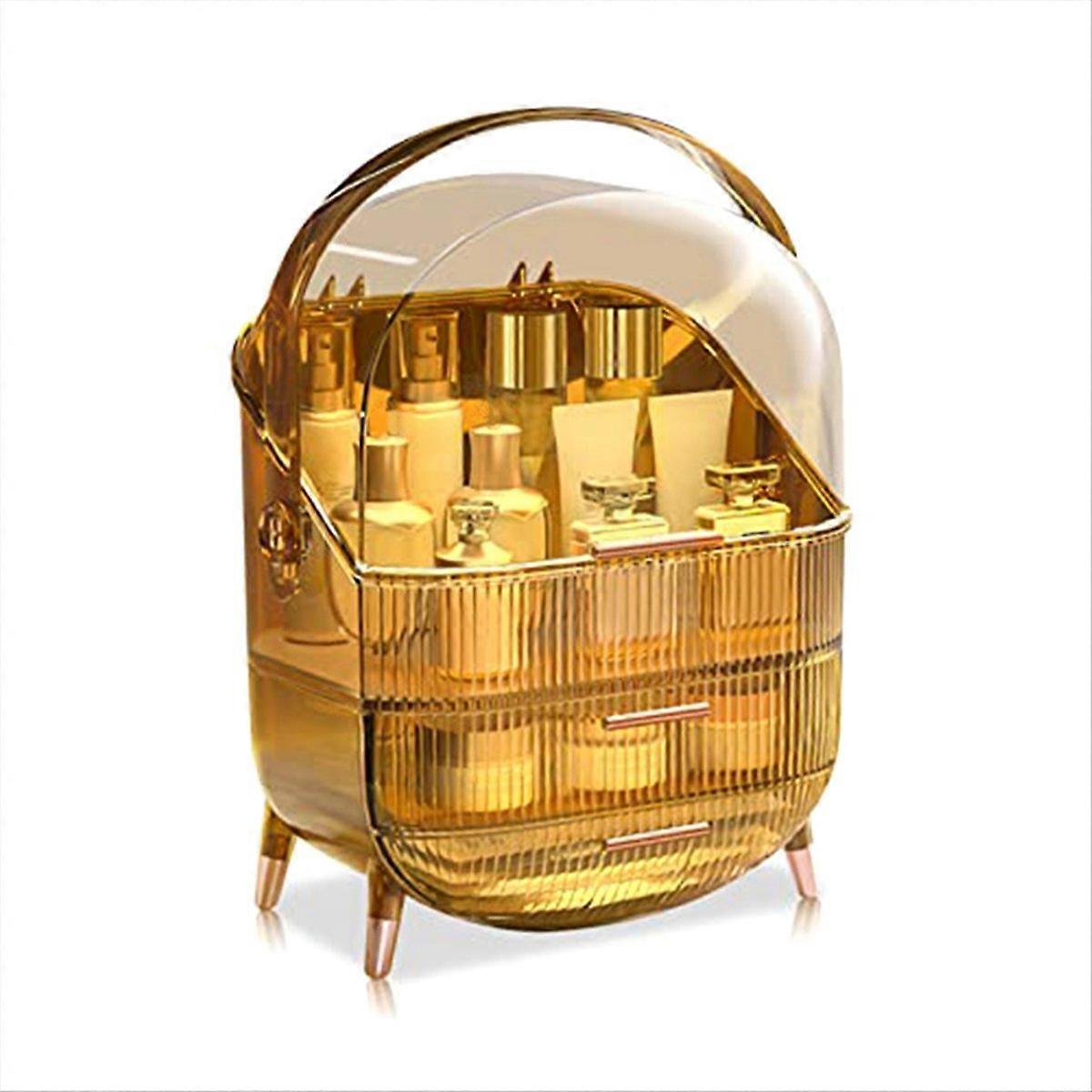 [Practical] : This dustproof cosmetic organizer is elegant to effortlessly meet any room decor, you could place it in your bedroom, bathroom, dressing room, bedside table, vanity countertop. [Large Capacity]: The makeup organizer box stores your cosmetic items of different shapes and sizes.The upper storage box can store most of the bottles on the market.The lower two-tier storage drawers could dividedly store lipsticks, lip gels, makeup brushes, eyebrow pencils, foundation sticks, beauty gadgets, necklaces, rings, and more.If you are a retro style lover, this storage box is your . [No Assembly Required]: Made of high-grade plastic material. High quality crushing resistance to injury and damage.This beauty organizer is enough for long lasting use, and takes up less room and make your place tidy. []: Great counter top organizer, a great gift choice for Christmas, Year, Valentine's Day, Mother's Day, Birthday. Gift for her, Mom, sister, girlfriend and wife;A for trendy women Streamline your beauty routine with the cosmetics storage solution. Great Perfect for Birthdays, Christmas, Year, Valentine's Day, Mother's Day, and more. Colour:C:amber Material:plastic Size:28.6 x 18.5 x 37cm Package Contents: 1 x Storage Box Only the above package content, other products are not included. Note: Light reflection and different displays may cause the color of the item in the picture a little different from the real thing. The measurement allowed error is +/- 1-3cm.