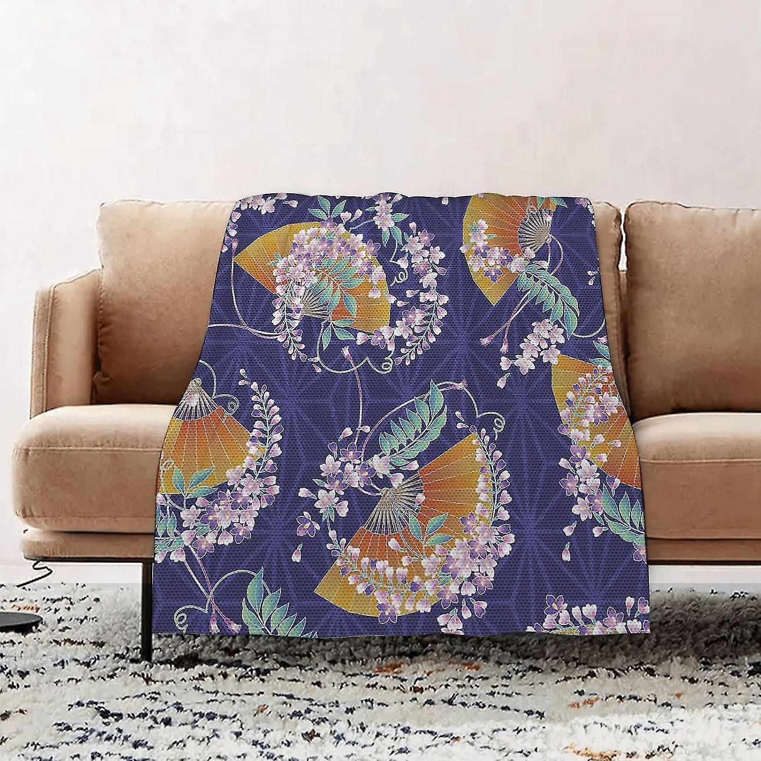 Premium Flannel Throw Blanket - Wisteria Flowers Kimono Pattern On A Geometric Background Traditional.marigo Flannel Blanket Sofa Throw, Blanket Fluff