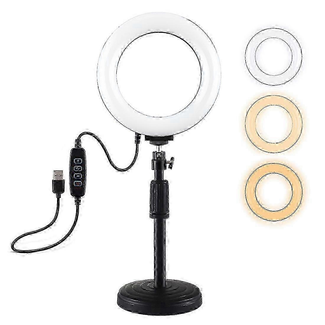 PULUZ Round Base Desktop Mount + 6.2 inch 3 Modes USB Dimmable LED Ring Vlogging Video Light, Adjustable Height: 18cm-28cm Ring LED Light 1. LED ring light can be mounted on the holder and take it anywhere, it can also be removed from the stand at any time, the tripod ball head can 360 degree rotating can free to adjust to any angle. 2. The ring light is made of energy-saving LED beads, it heat dissipation is excellent, constant current drive and high color rendering, soften the light source and enhance skin tone in portraits photography. 4. 3 colors lighting mode adjustable brightness for your choose,you can adjust the color and brightness very easily, excellent brightness can be achieved without installing extra colorful filters. Three colors of soft natural light illuminate your beauty in different occasions. 5. The USB ports can be used with multiple devices, such as connect computer host, laptop, mobile power and USB charger. You will be able to enjoy LED ring light at any time free. 6. Lightweight and portable design: Convenient to use and carry when you traveling or working outdoor etc. 7. The function of heat dissipation: ABS shell, even if it is used for a long time,there is no need to worry that the lamp will be hot. 8. Extensive application: It is widely applied to outdoor photo light, filling light indoors, portrait, fashion, advertisement photography, shooting video etc. Ring LED Specifications 1. Number of beads: 2x36pcs 2. Lamp bead model: 2835 3. Lamp brightness: 24-26lm 4. White light color temperature: 6500K 5. Warm white color temperature: 3200K 6. Power: 0.36-7W 7. Voltage: 5V 8. Indicates: Ra>90 9. Dimming range: 1%- 10. Shell material: ABS, Acrylic light cover 11. Dimensions: outer diameter 160mm. inner diameter 110mm 12. Power supply: USB port power supply Desktop Mount 1. Metal retractable neck frame, adjusting height 15.5cm up to 25cm. 2. Adjustable table top mini desktop mount for LED Ring Light, Desk Makeup Light. 3. Elegant a Note: Due to the light and screen setting difference, the item's color may be slightly different from the pictures. Please allow slight dimension difference due to different manual measurement.