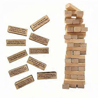[High-quality Material]The Questions Tumbling Tower Game is made of high-quality wood material with no burrs, which is sturdy and durable. It will not hurt your hands when playing with it. [Improve Ability]Questions Tumbling Tower Game is a fun and challenging game that enhances your concentration, hand-eye coordination, logical thinking, creativity, and fine motor skills. [Develop Social Skills]This Questions Tumbling Tower Game is a great way to play with family, friends, or colleagues, enhance relationships, increase communication, and develop social skills. [Fun and Challenging]This Questions Tumbling Tower Game has a unique design that makes it more than just a stacking game. Each block has a question on it that you have to answer before placing it on top of the tower. It adds extra fun and challenge to . [Fun and Engaging]This Questions Tumbling Tower Game is a great ice breaker challenge for any party, team building exercises, family , or date night. You can also use it as a dinner game to spice up your mealtime. note: The color of the pine wood style is brighter. There may be some color difference from the picture. It does not affect normal use. single size: 8 x 2.5 x 1cm Material: wooden colour: log wood Package Contents: 54 x Questions Tumblin' Tower Game Only the above package content, other products are not included. Note: Light reflection and different displays may cause the color of the item in the picture a little different from the real thing. The measurement allowed error is +/- 1-3cm.