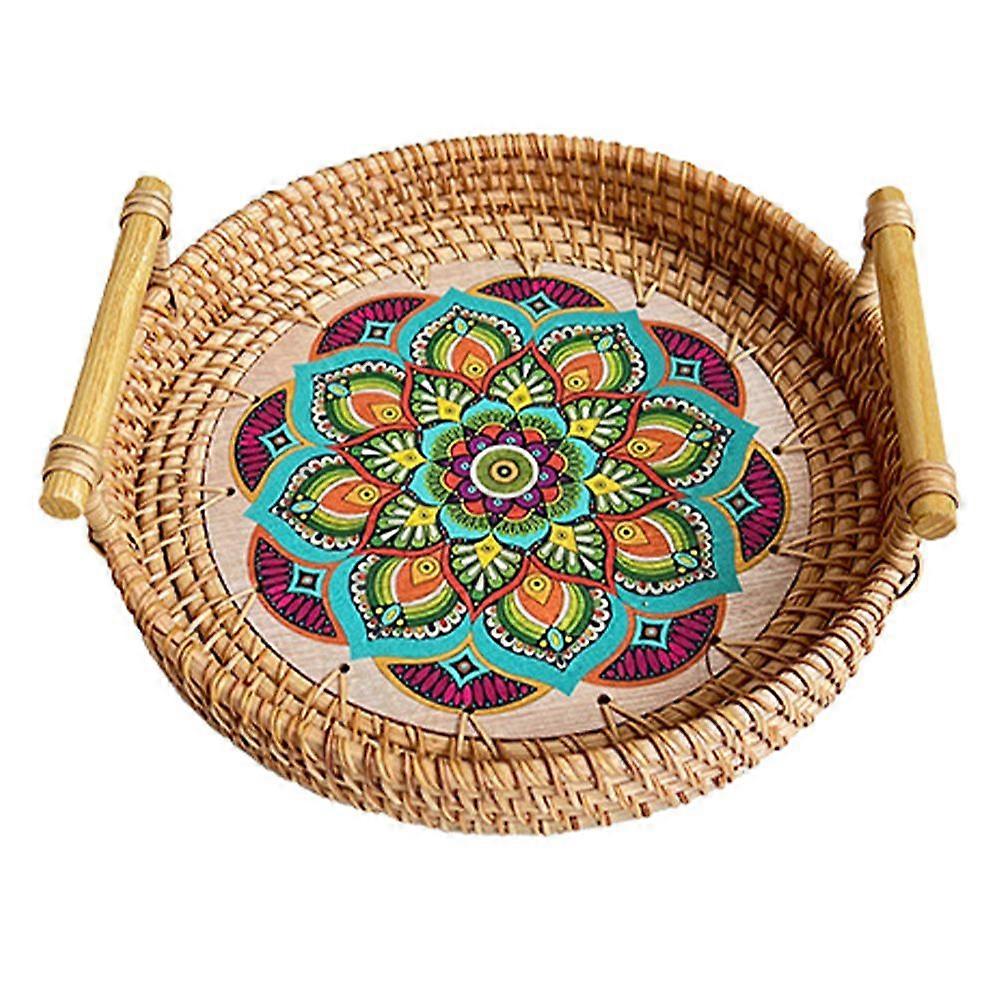 Rattan Serving Tray with Handle Mandala Pattern Food Snack Platter Picnic Serving Plate
