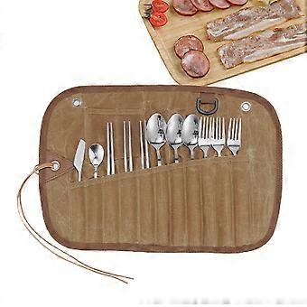 1.The portable utensil pouch features a convenient design that allows for easy storage and access to your forks, spoons, and chopsticks while camping, hiking, or enjoying a picnic without worrying about lost cutlery. 2.Multislot storage keeps each piece of tableware organized, helping you quickly find the right utensil. The spacious compartments are for storing forks, spoons, and chopsticks for any outdoor adventure. 3.This reusable utensil pouch is made from durable, material, designed to withstand the outdoors. It's for camping, hiking, or daily use. 4.With its hanging loop, this outdoor storage bag can be conveniently attached to your backpack, tent, or campsite setup for easy access and storage. for outdoor dining or taking on your next adventure.