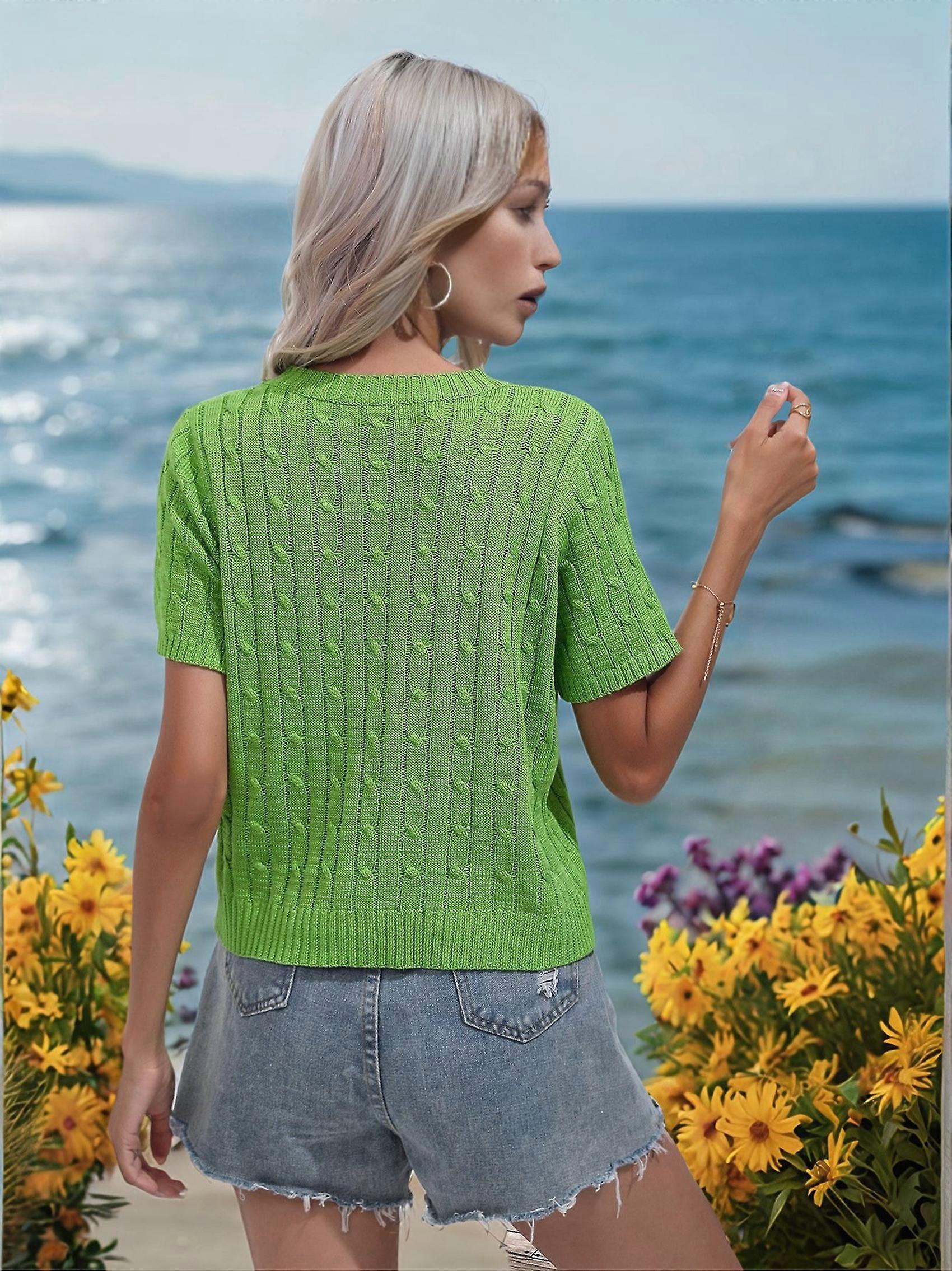 Round Neck Solid Color Sweater Green L