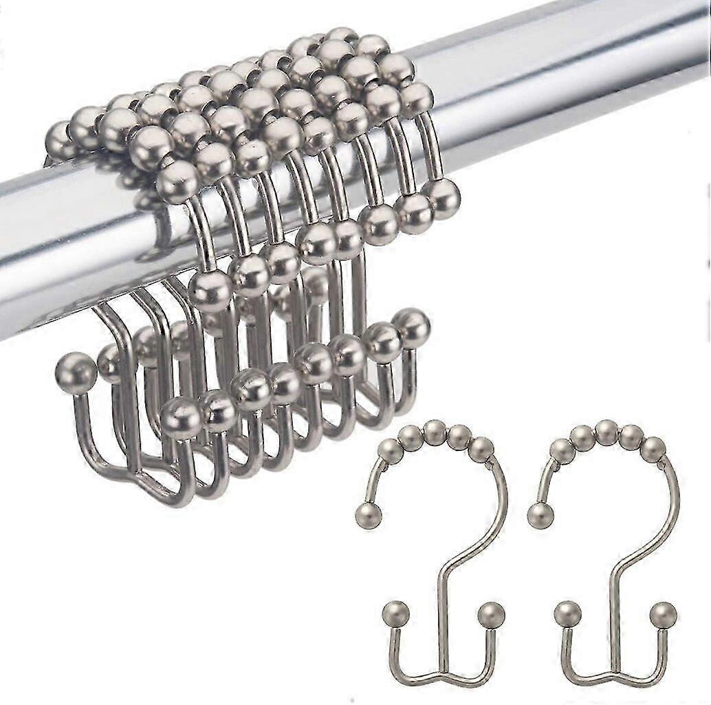 Easy Roller Glide: Easily install and remove shower curtains with dual sliding shower hook loops. Design: Comes with double sliding shower curtain hooks to hang shower curtain and tub separately. Rust-Proof: Made of durable, rust-proof, oxidation-resistant metal. Fits all standard size shower curtain rods. Double Hooks - Double shower curtain hooks are strong enough to secure heavy curtains and liners. 12-Piece Shower Hook Set: Sold in sets. 12 pieces for standard shower curtain installation. Product Features - Matte Nickel Color - Polished for a premium look - Easy to use installation - Frictionless, sliding Durable and secure construction allows for easy movement