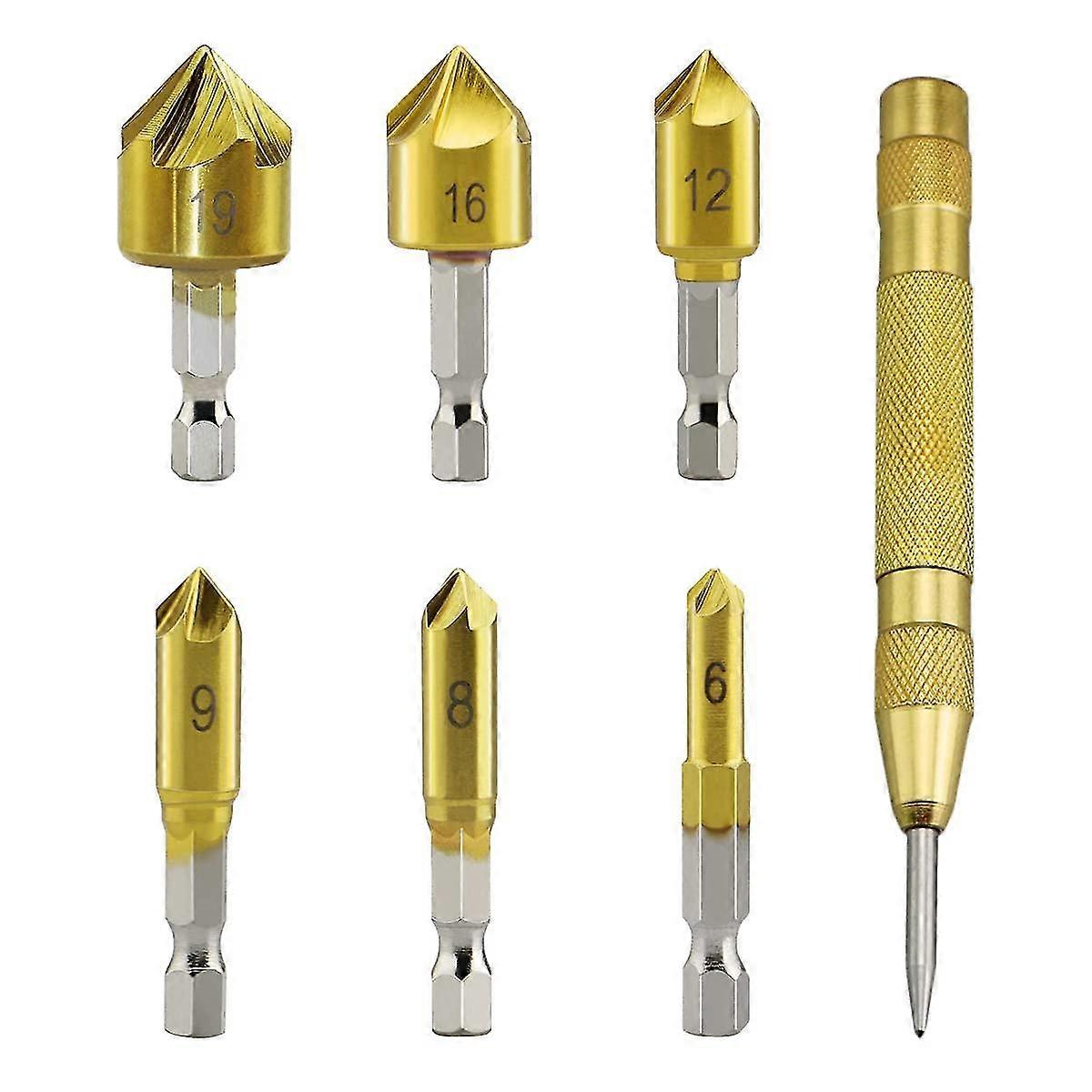 Saipor 6pcs 1/4'' Hex Shank Hss Countersink Drill Bit 5 Flute Countersink 90 Degree Chamfering Drill Bit For Wood Diy, 6/8/9/12/16/19mm