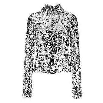 Naisten kesäinen korkeakauluksinen paljetein koristeltu pitkähihainen paita