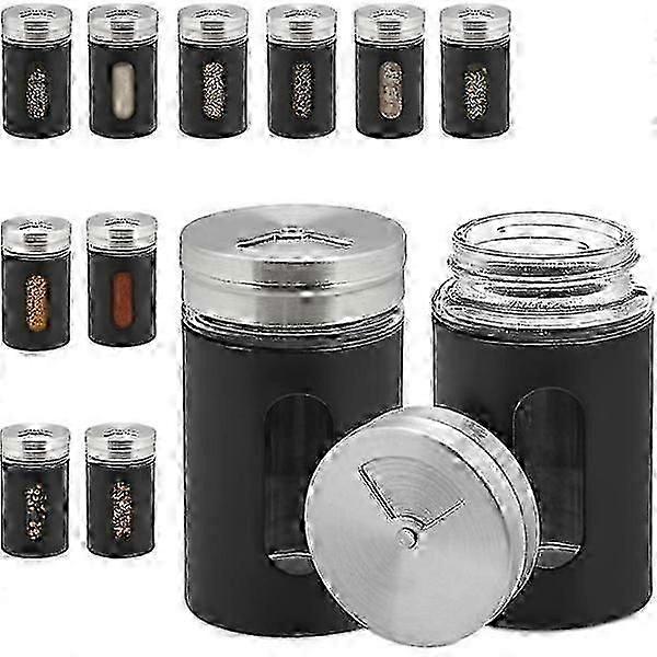Set of 12 Glass and Stainless Steel Spice Shakers with 3 Hole Sizes - 90ml Capacity in Black/Silver