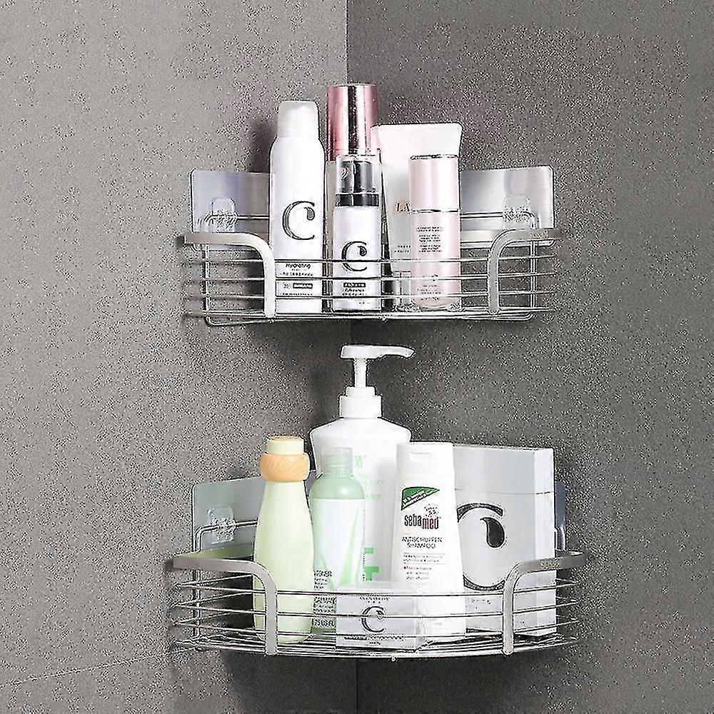 Set Of 2 Corner Shower Shelf Without Drilling Adhesive Bathroom Shelf Stainless Steel Triangle Basket Storage For Shampoo Soap With Hooks