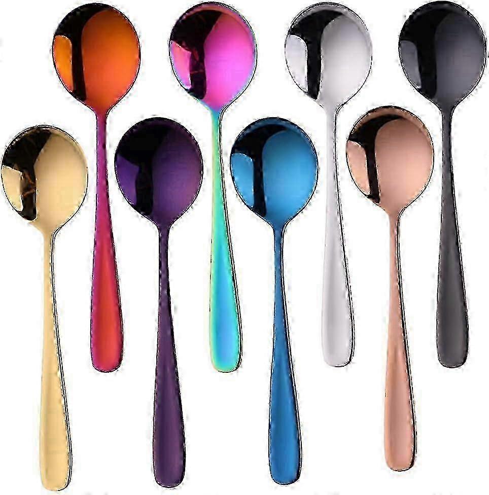 1. Package includes: 8 colored Soup Spoons, 304 stainless steel 18 or 10. Support dishwasher, but hand wash is more recommended! 2. Round design, ergonomic handle with glossy finished, suitable for restaurant, hotel, wedding family table use. 3. Available 8 Color for multiple choice: silver, black, blue, purple, gold, rose gold, rainbow and brown red. 4. Suitable for soup, dessert, cereal, porridge etc. Note: Due to the light and screen setting difference, the item's color may be slightly different from the pictures. Please allow slight dimension difference due to different manual measurement. Sold by-YJL official store
