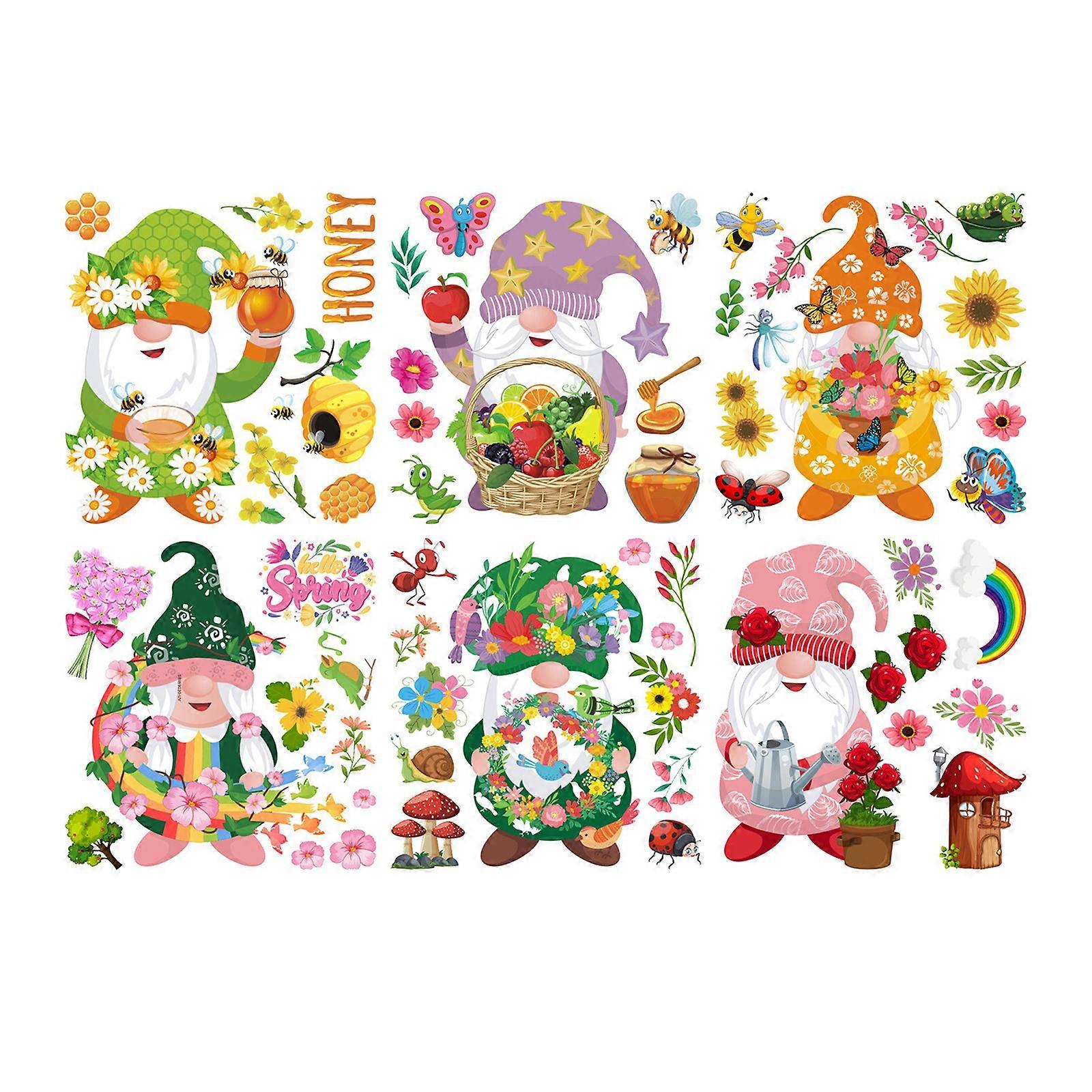 Spring Gnome Stickers 6 Sheets Flower for Butterfly Bee Window Clings Decals for Home Office Party Background Decoration