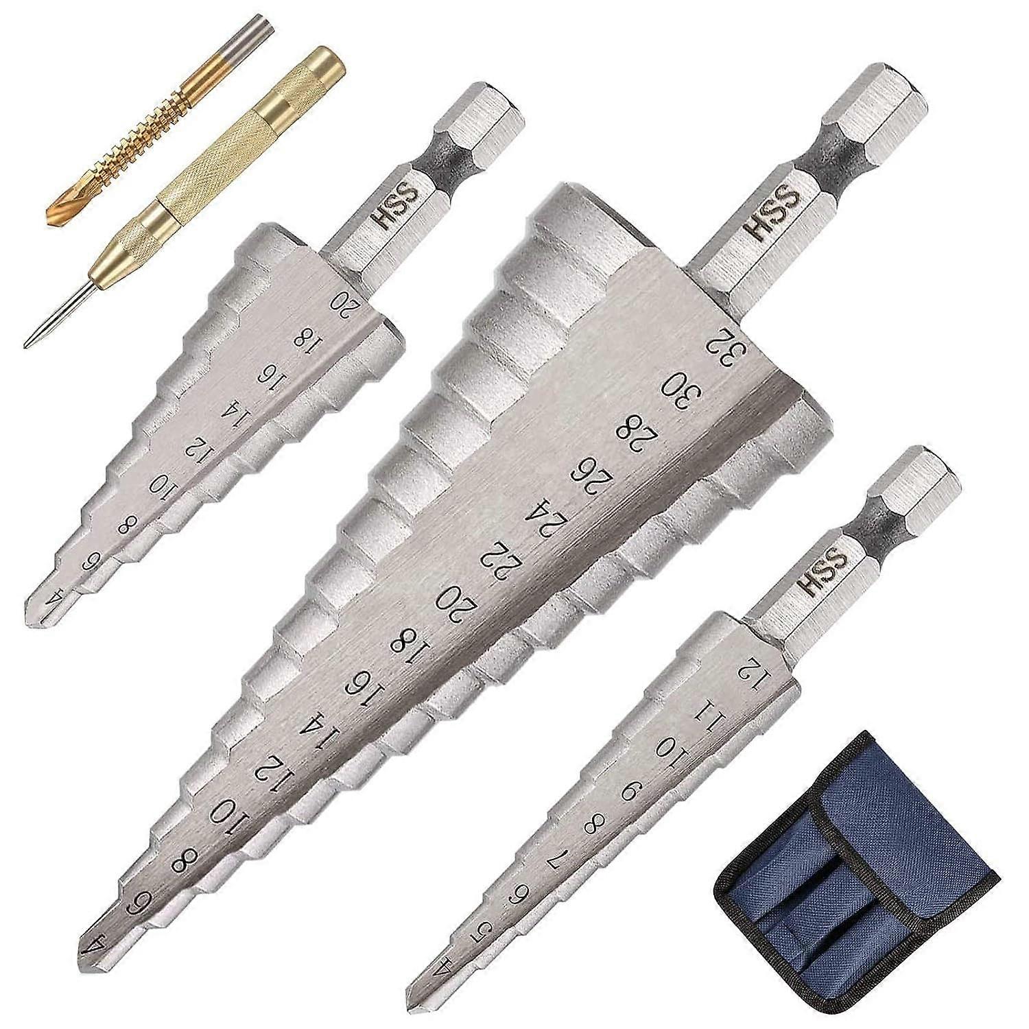 Step Drill Bit, 3PCS(4-12/20/32mm)Double Slotted Tapered Step Countersink Drill Bit with HSS Titanium Coating,Hexagon Shank,Auto Center Punch and Twis