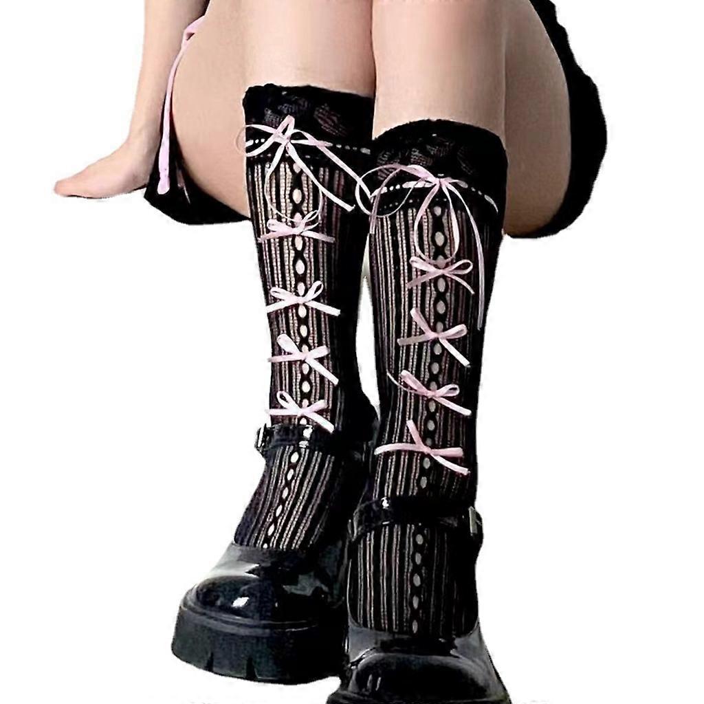 Summer Hollows Ribbed Stocking Ballet Style Bows Tie Knee Length Long Sock