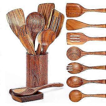 Teak Wooden Cooking Utensils Set 9-Piece with Holder - Non-Scratch Spatulas, Spoon Rest, Utensil Holder