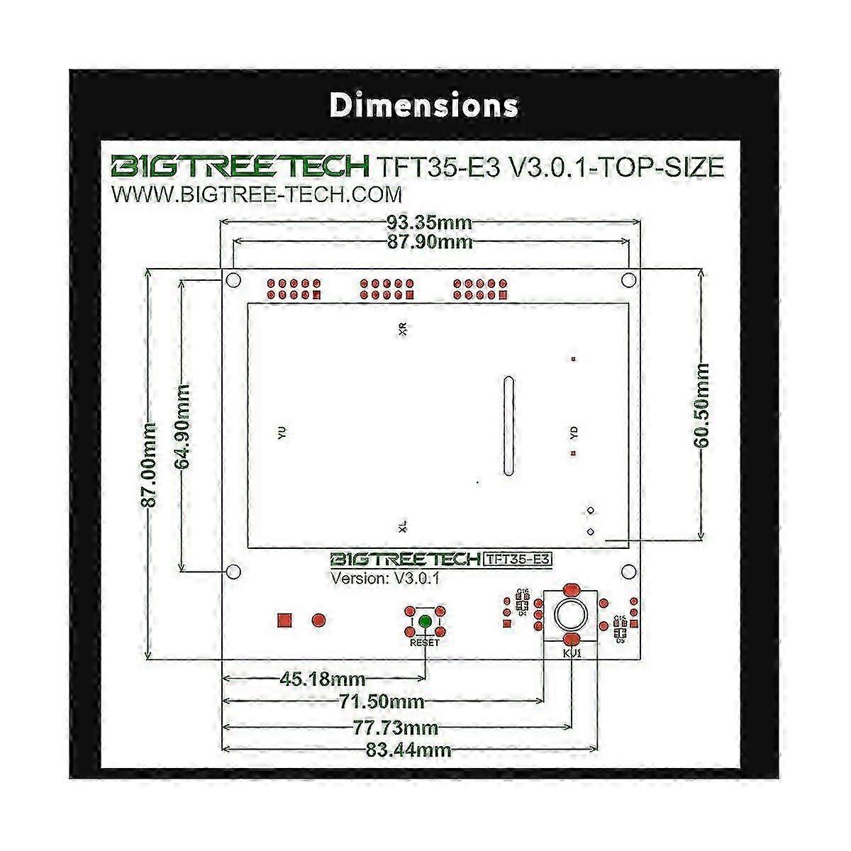 Item Type: Display Screen Model Number: TFT35 E3 V3.0.1 Product Name: TFT35 E3 V3.0.1 Touch Screen Working Mode: Touch Screen/12864LCD Mode Master Chip: GD32F205VCT6 Color: black Material: plastic+metal Microprocessor: ARM - 32bit CPU 120MHz Support Wifi: Reserve WIFI Port Power Input: DC 5V SD Card Voltage: 3.3V and 5V Replace: for 3 Original LCD Compatible With: for 3 Suitable For: SKR MINI E3 V2.0/SKR MINI E3 V3.0/Octopus/Octopus Pro Usage: 3D Printer Parts Appearance size: 93 x 87MM Package Contents: 1 x TFT35 E3 V3.0 Touch Scree 3 x cables Only the above package content, other are not included. Note: Light reflection and different displays may cause the color of the item in the a little different from the real . The measurement allowed is +/- 1-3cm.