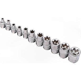 Torx Socket Set, 11-Piece, E4-E20, Hex Interior, External Rail, 1/4in, 3/8in, Silver Tone