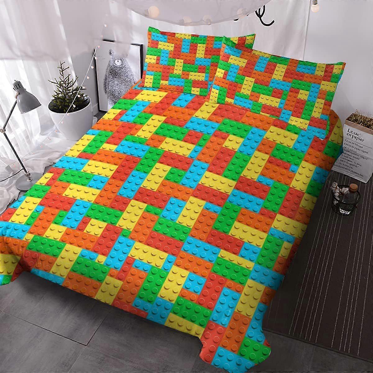 Twin Duvet Cover Set - Soft Colorful Building Blocks Bedding Set Fun Geometric Brick Pattern Comforter Cover Yellow Orange & Green - Gaming Bedspread