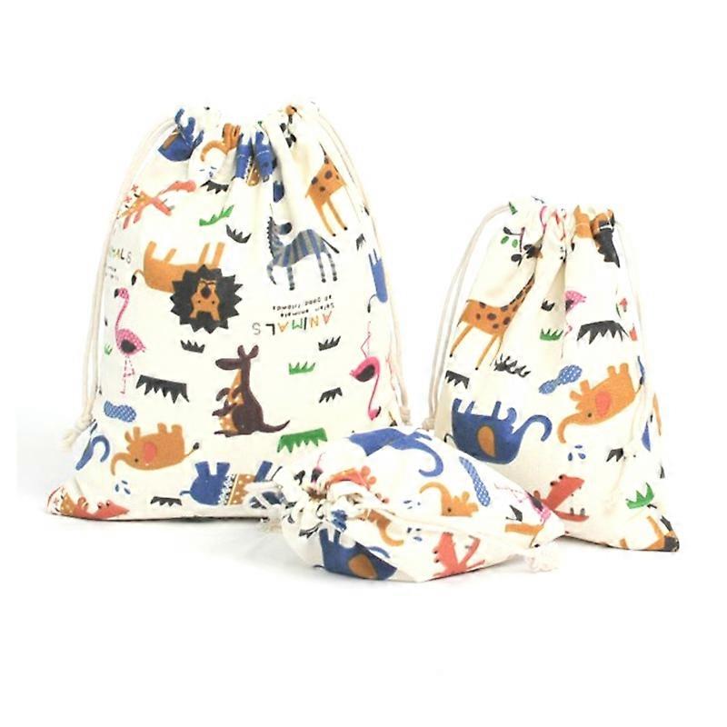 TZ 3Pcs Set Cute Animals Pattern Canvas Drawstring Bags for Home Travel Reusable Organizer Storage B