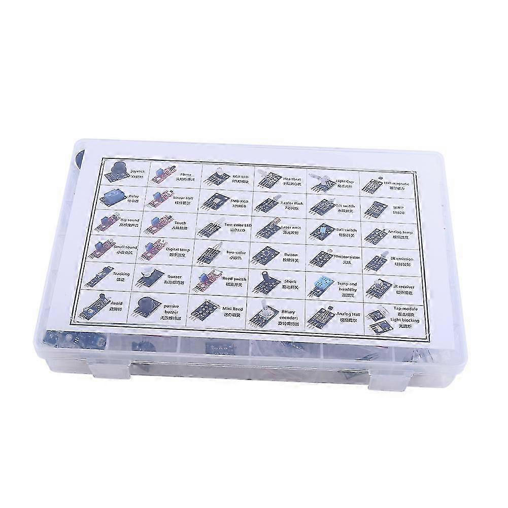 _x000D_ This is a very good kits which developed specially for beginners. It is a complete set of most common and useful electronic components. All sensors are carefully selected and tested. Sensors implementation and programming is a key skill for beginners to design their DIY project. To help starters to learn sensor programming, this sensor modules kit has delicately selected sensors to detect temperature, humidity, sound, light, infrared, motion and many other commonly-used properties. _x000D_ _x000D_ Features: _x000D_ 37 sensor modules and 1 listing paper in one plastic box. _x000D_ A complete set of most common and useful electronic components. _x000D_ It is extremely easy for fancier to control and use these modules. _x000D_ The sensors come in a handy protective plastic box. _x000D_ Sensors to detect temperature, humidity, sound, light, infrared, motion and many other commonly-used properties. _x000D_ _x000D_ _x000D_ Specifications: _x000D_ Box Material: PVC _x000D_ Box Size: 27.5 x 17.6cm / 10.82 x 6.93" _x000D_ Module Quantity: 37 _x000D_ Weight: 405g(approx.) _x000D_ _x000D_ _x000D_ Package Includes: _x000D_ 1 x Joystick XY Module_x000D_ 1 x Flame Sensor Module_x000D_ 1 x RGB LED Module_x000D_ 1 x Heartbeat Sensor Module_x000D_ 1 x Light Cup Module_x000D_ 1 x Hall Magnetic Module_x000D_ 1 x Relay_x000D_ 1 x Linear Hall Module_x000D_ 1 x SMD RGB Module_x000D_ 1 x 7-color Flash Module_x000D_ 1 x Tilt Switch Module_x000D_ 1 x TEMP 18820 Module_x000D_ 1 x Big Sound Module_x000D_ 1 x Touch Module_x000D_ 1 x Two-color LED Module_x000D_ 1 x Laser Emit Module_x000D_ 1 x Ball Switch_x000D_ 1 x Analog Temp Module_x000D_ 1 x Small Sound Module_x000D_ 1 x Digital Temp Module_x000D_ 1 x Two-color Module_x000D_ 1 x Button Switch_x000D_ 1 x Photo resistor Module_x000D_ 1 x IR Emission Module_x000D_ 1 x Tracking Module_x000D_ 1 x Buzzer Module_x000D_ 1 x Reed Switch_x000D_ 1 x Shock Switch_x000D_ 1 x Temp and Humidity Module_x000D_ 1 x IR Receiver Module_x000D_ 1 x Avoid Module_x000D_ 1 x Passive Buzzer Module_x000D_ 1 x Mini Reed Module_x000D_ 1 x Rotary Encoder Module_x000D_ 1 x Analog Hall Module_x000D_ 1 x Tap Module_x000D_ 1 x Light Blocking Module _x000D_ _x000D_ _x000D_ Note:_x000D_ 1. Please allow 1-3mm error due to manual measurement. Thanks for your understanding._x000D_ 2. Monitors are not calibrated same, item color displayed in photos may be showing slightly different from the real object. Please take the real one as standard.