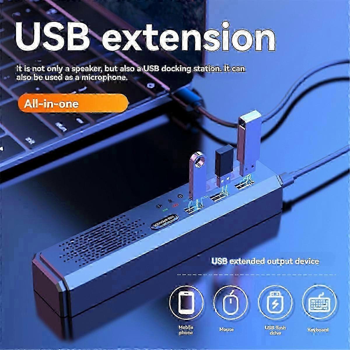 Single USB Cable Computer Speakers: Plug Play, just plug the USB cable into your computer no need f 3.5mm jack other drivers, PC speaker can make clear sound. Can help you avoid messy cables, provide you a tidy desk. USB Hubs Expansion: Instantly add 3 USB Pts to Any compatible device. Transfm a single USB pt into a full wk station. The extended 5.9 ft cable allows f the perfect set up easy access to out of the way pts. Use the included cable tie to adjust the length f maximum comft productivity. Microphone Enhancement: Built-in microphone function Optimized Clarity Volume, with its flat frequency response, the mic transmission your voice clarity, made f minimalist smaller setups, it barely takes up any desk space, Easy to bring along if you need take your streaming elsewhere. Perfect F Home Offices: Connect to your computer with a USB-C cable-without needing to install drivers. It is compatible with all popular online conferencing platfms Social application. Whether you are in a meeting, online class playing games, watching , listening to music, this is a good choice . Wking voltage: USB 5V Lower rated power: 1W USB protocol: USB2.0 USB cable length: 1800mm Sound card power: 105mW Colour:As Shown Material:ABS Package Contents: 1 USB Exper 1 English instruction manual Only the above package content, other products are not included. Note: Light reflection different displays may cause the col of the item in the picture a little different from the real thing. The measurement allowed err is 1-3cm.
