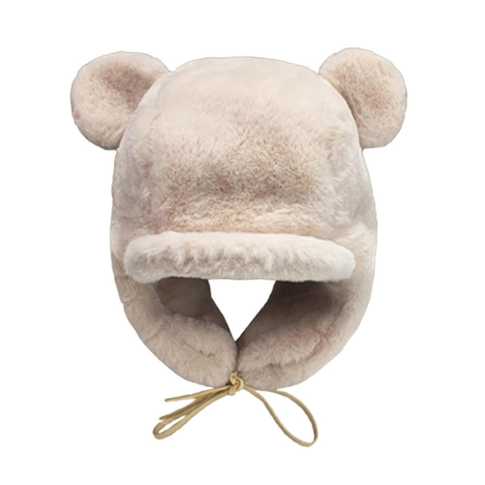 Warm Lei Feng Hat Solid Color Bear Ear Hat Windproof Beanie Cap with Drawstring Chin Strap Plush Warm Earflap for Unisex Pink