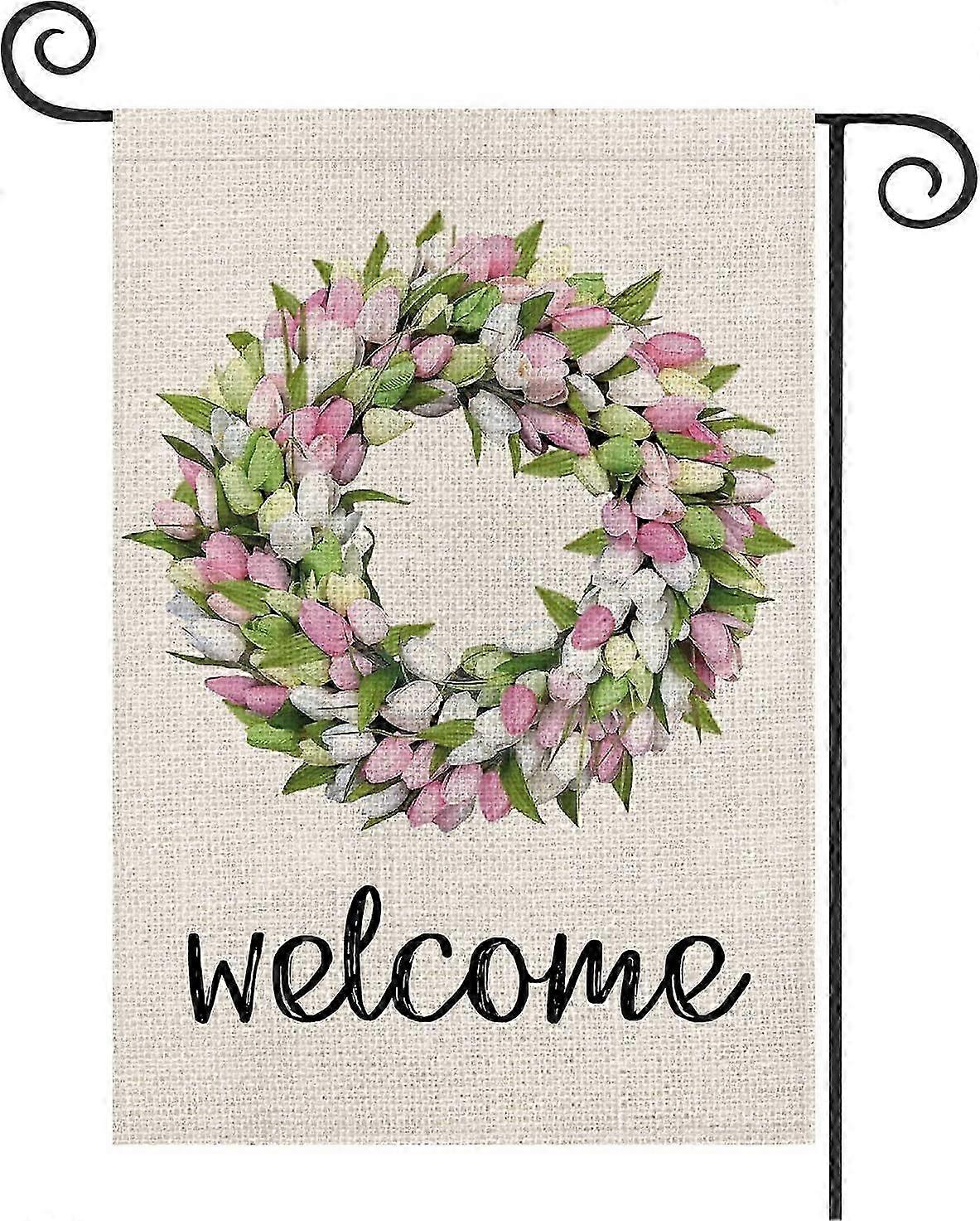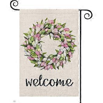 Welcome Tulips and Lily Wreath Garden Flag Vertical Double Sized, Seasonal Spring