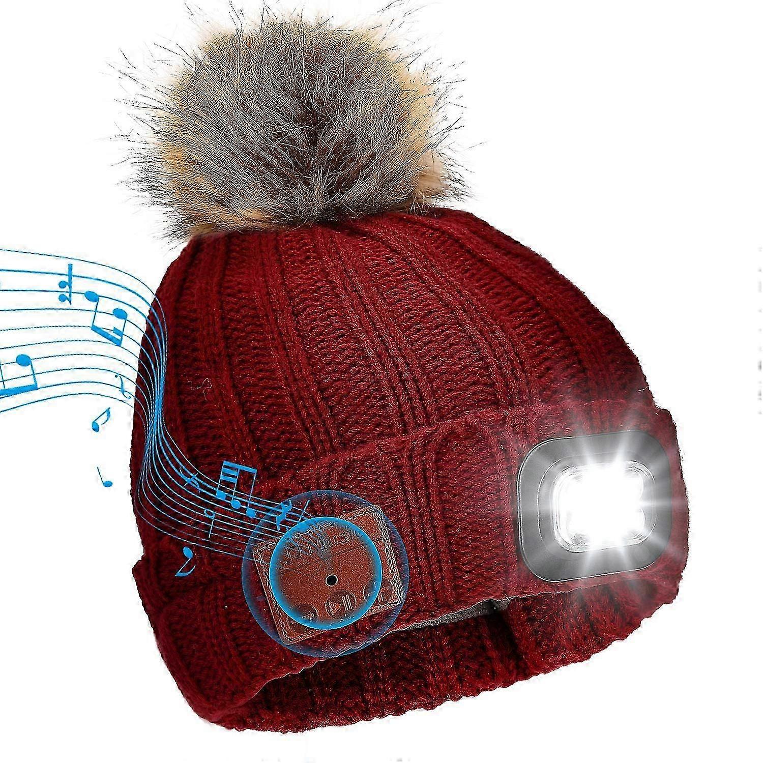 Wireless Bluetooth Beanie Hat with 4 LED Headlamp USB Rechargeable V5.0 Beanie Hat Warmer Fleece Lined Built-in Stereo Speakers and Mic
