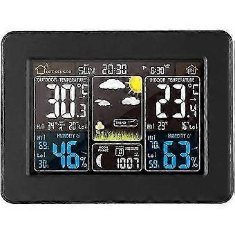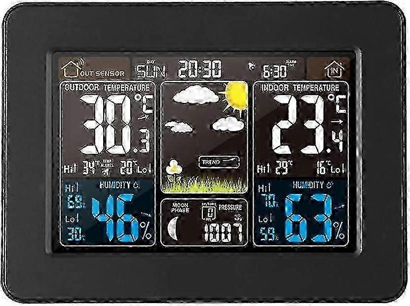 Usage Tips: [WEATHER STATION FUNCTIONS] Color weather forecast; indoor/outdoor thermometer and hygrometer; MAX/MIN temperature and humidity display; Barometric pressure; Moon phase; daily alarm and snooze function ;3-level backlight with USB cable. [WEATHER FORECAST FUNCTION] With outdoor wireless remote sensor (range up to 197 feet) and use of 7 color icons; Weather symbols indicate weather fluctuations over the next eighthours, not current weather conditions. [BAROMETER THERMOMETER HYGROMETER FUNCTION] Indoor/outdoor temperature and humidity display in C or F optional. Min / Max display for air humidity and temperature. Atmospheric pressure trend display;The exterior ice alert symbol will appear and the alarm tone will sound when the exterior temperature is between 30 and 37F. [DAILY CLOCK ALERT FUNCTION] Manual time setting; Time also optional 12/24; Easy on/off daily alarm with snooze function; Low battery indicates when to use battery only. [POWER REQUIREMENTS] 2 x AA batteries (not included) or USB cable (included). Press the SNOOZE button to select 3-level backlight when the adapter is plugged in. Add it to cart as an ideal gift for a friendor yourself with a nice package. This weather clock predicts weather fluctuations in the next 8 hours / or more. Instead of showing current weather conditions. At the same time, there will be differences due to sudden weather phenomena. For gardeners or plant lovers, this item can help them take care of flowers in time. Seven weather forecasts are available: sunny, cloudy, cloudy, light rain, heavy rain, light snowfall, heavy snowfall. Features: Type: Forecast Clock Material: plastic Color: Black Power source: 2 AA batteries (not included) / DC 4.5V 150Ma RF detection frequency: 433.92 MHz Detection range: 60m / 100ft Humidity and trend display: 20%RH-95%RH Size: 17.5*13.5*8.0cm/6.9*5.3*3.1(L*W*H) Net weight: 550.0g / 19.4oz Package includes: 1 * Forecast Clock 1 * outdoor sensor 1 * USB cable 1 * English User Manual