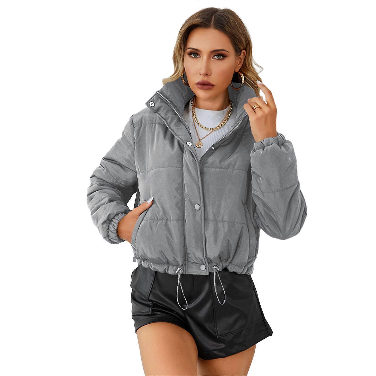 Women Cropped Puffer Jackets Winter Button Zipper Stand Collar Lightweight Drawstring Short Coat Outerwear with Pockets XS Gray