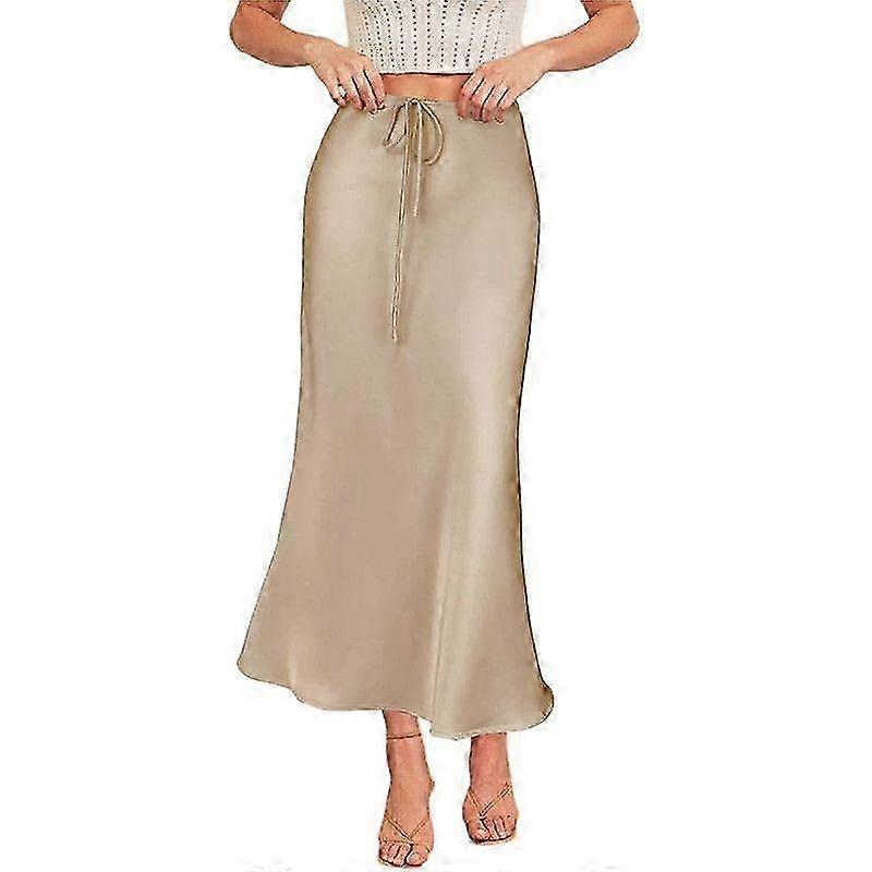 Women's Drawstring Satin Maxi Skirt High Waist Silk A Line Flowy Long