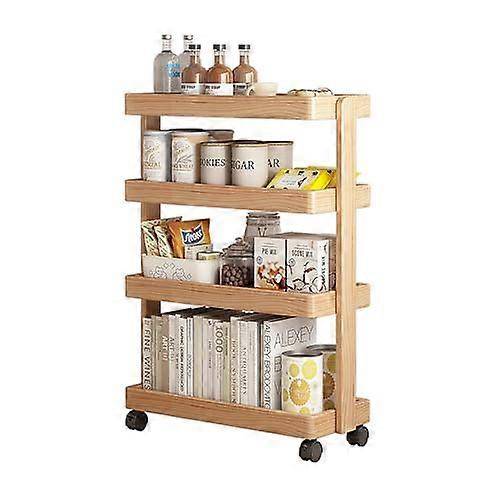 Wooden Storage Cart Solid Oak 4 Tier Slim Rolling Shelf with Locking Wheels for Small Spaces Natural