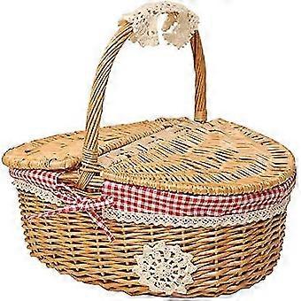 Woven Wicker Picnic Hamper With Lid - Country Style With Red And White Checkered Cotton Lining - Presentation Hamper